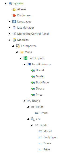 The mapping between input data and the content structure in Sitecore is defined in a map branch under the system/Modules/Ez Importer/Mapsnode. A list of input column items is created, followed by a mapping structure defining what template to use and what input column maps to what template field.