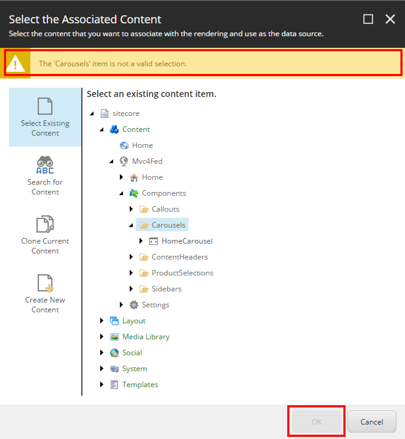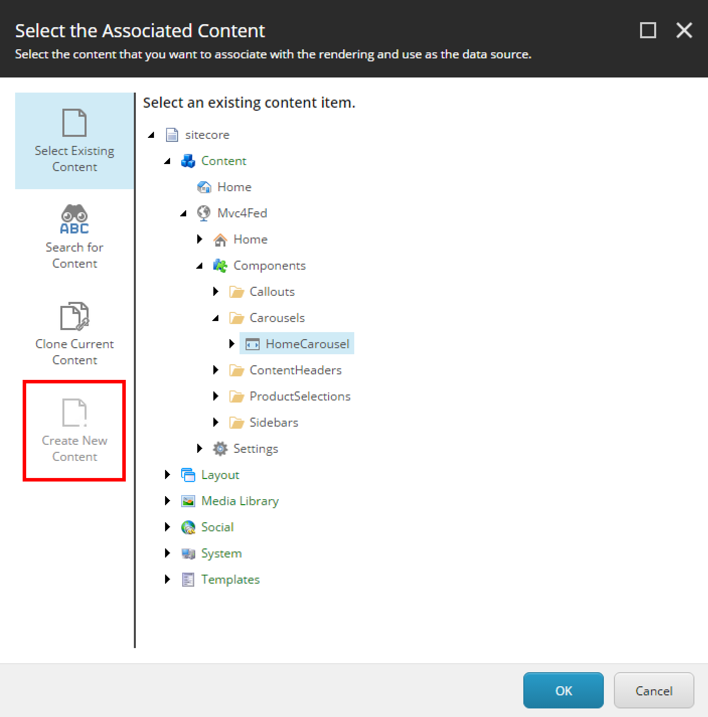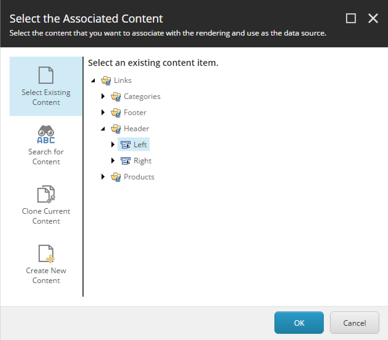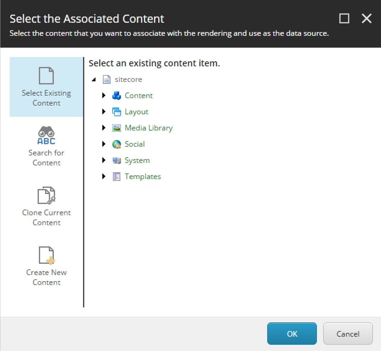 How the select datasource dialog looks when the datasource location not set on the rendering definition item - the user sees the entire content tree.