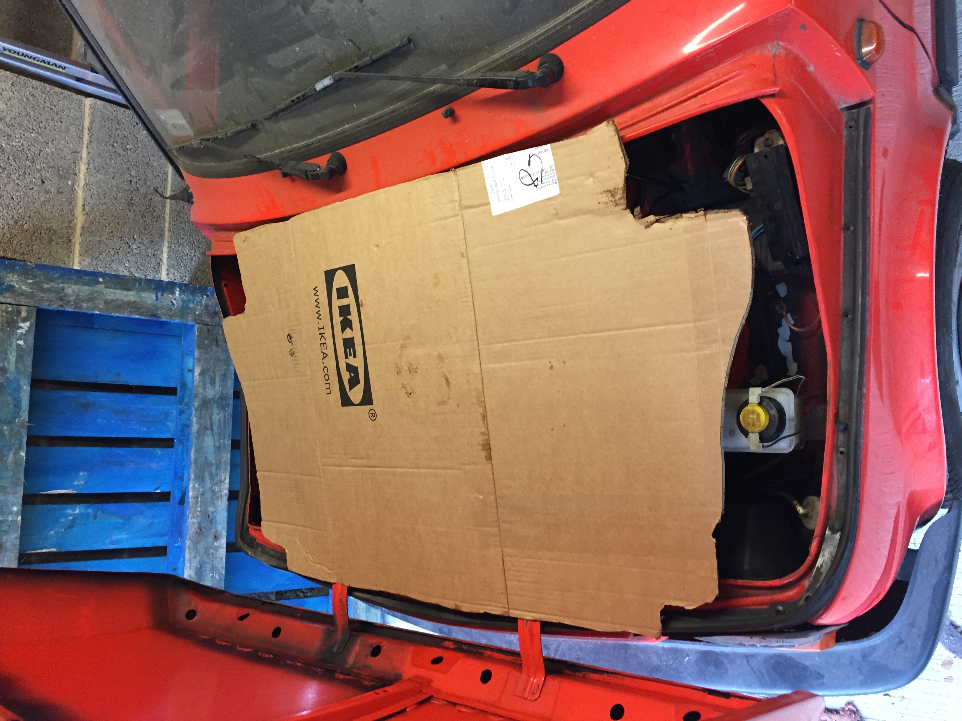 When this arrived I had a crazy idea that the whole thing might juuuust fit into the front (frunk?) of the Fiat. After failing miserably at hoisting it up into the air with a pulley, I gave up and made a cardboard template of the main shape and tried it for size. Alas, it was a few centimetres too big, so on with the teardown.